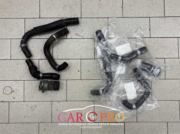 좌 - 탈거한 EGR쿨러냉각호스2개, 인렛호스1개, 오일쿨러냉각호스 1개