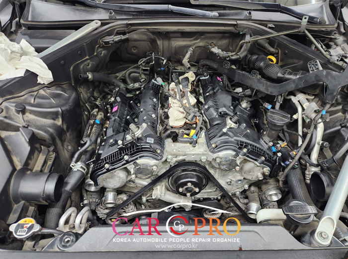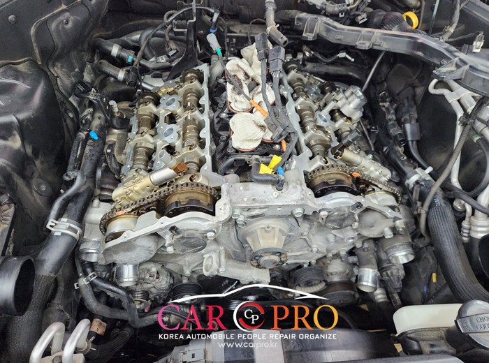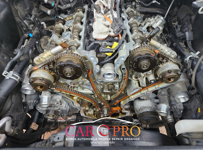 로커커버 어셈블리 교환과 프론트타이밍커버 오일누유정비가 필요하고