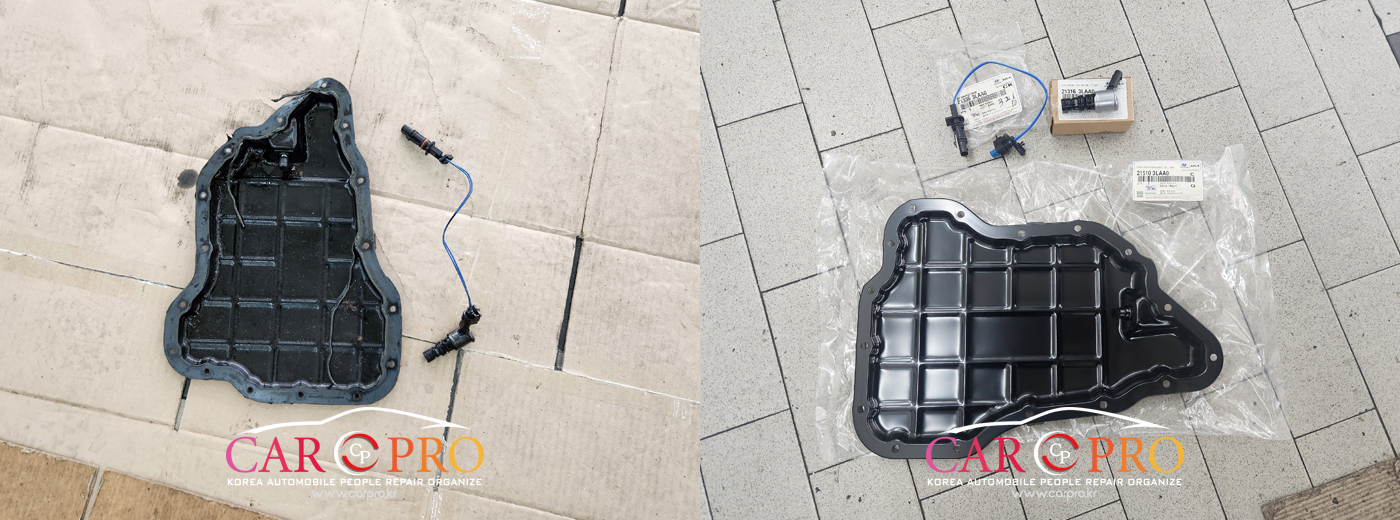 좌 - 탈거한 엔진오일팬, 엔진오일펌프컨트롤솔레노이드밸브